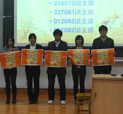 大会开始,全体起立唱中国共产主义青年团团歌。PA集团官方网站副院长吴荣顺老师发表讲话,肯定了PA集团官方网站各系领导及团干部的工作,并强调了学院今后应向专业化、制度化方向发展。随后各系分别选出一个优秀支部的团日活动作展示并进行选字答辩。这次的团日活动全院共评选出一等奖6名,二等奖15名,三等奖45名。其中经管系荣获三个一等奖,赢得了校领导的一致好评。这三个团支部分别为07财管2支部,08公管支部,08国贸支部。07财管2支部代表经管系参加了此次团日活动展示并作出了精彩的答辩。