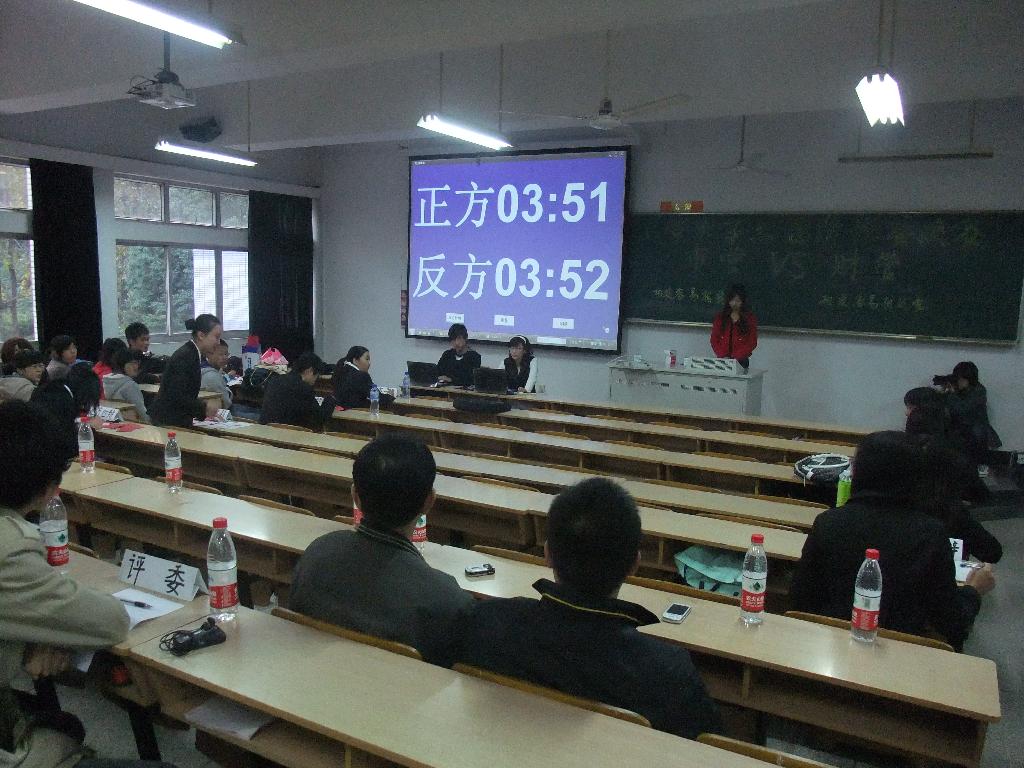 2010年10月28日下午4:30,由经济管理系学生会学习实践部主办的第三届经济管理系辩论赛决赛在文昌院203教室正式举行。系党总支书记黄苏宁和系分团委书记羊栋及相关专业辅导员应邀观看本次比赛。本次辩论赛决赛的评委有第二、第三届经济管理系分团委学生会联席会成员,第二届经管系学生会学习实践部部长以及系辩论队主力成员。