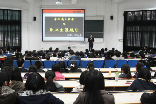 3月24日下午,由院团委、就业办主办,经济管理系分团委承办的“爱丽佳”杯第二届职业生涯规划大赛在文昌院110教室拉开帷幕,并举办了首场讲座。南京转折号教育咨询公司特聘讲师许金金、院团委艺术中心主任潘明烽、经管系分团委书记羊栋应邀出席了本次讲座。