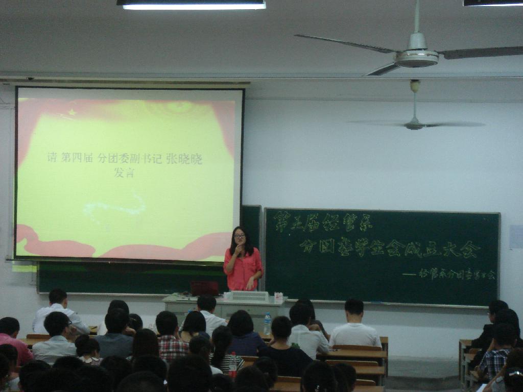 首先由羊栋老师总结过去一年来的成果并宣读第五届经管系分团委学生会副部以上名单。接下来是由第四届分团委副书记张晓晓同学分享了她3年来在参加分团委学生会成立大会时的不同感受并预祝第五届经管系分团委学生会再创辉煌。除此之外,第四届体育部部长郭晓军同学作为第四届部长代表也对所有帮助与支持分团委学生会工作的同学表示了感谢,并让大家能够坚持自己的选择。第五届学生会主席陆丹丹同学给我们分享了她进入学生会的经历并激励我们要为理想努力奋斗。第五届学习实践部新生代表黄伟杰同学是新进的学生会成员,他给我们讲述了自己进入分团委学生会后的感受--那是一种家的感觉。