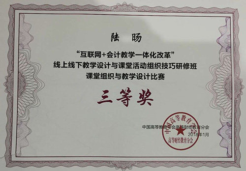 20181月,由中国高等教育学会高等财经教育分会主办的“互联网+会计教学一体化改革线上线下教学设计与课堂活动组织技巧研讨会”在广州举行,全国83所财经类院校共216名专家学者参会。我校PA集团官方网站财务管理专业教研室主任陆旸及财务管理专业青年教师卢颖应邀参加,陆旸老师在团队课赛中获得三等奖。