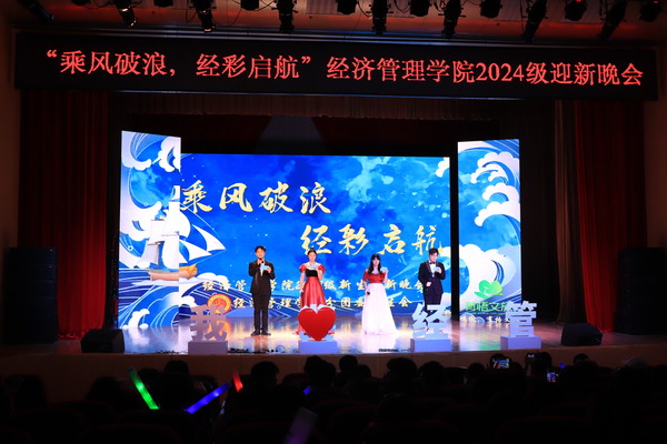 以美育人、以文化人,迎新晚会深植中华优秀传统文化沃壤,大力弘扬中华美育精神,由“初秋伊始,星辰初遇”“青春绽放,梦想起航”“携手经管,逐梦成贤”三个篇章组成。每一篇章以原创设计开启,涵盖合奏、歌舞、情景剧等多种表演形式,情感细腻的台词、充满活力的舞蹈和动听的音乐交织在一起,为广大师生呈现出一幅幅青春校园的缤纷画卷。活动在《最炫民族风》中拉开了序幕;歌舞《新贵妃醉酒》广袖舒展,红扇翻飞,感古典之魅力,传国潮之优雅;小品《军师恋盟》饶有风趣,以一场别开生面的恋爱观教育课,引得台下笑声不断;晚会现场回顾了分团委新媒体中心精心制作的军训视频,带领新生重温共同奋斗的时光,感悟自己的成长;歌曲《小美满》将晚会的氛围推向高潮,辅导员用歌声表达了对同学们满满的期望,诠释了立德树人的情怀与追求。