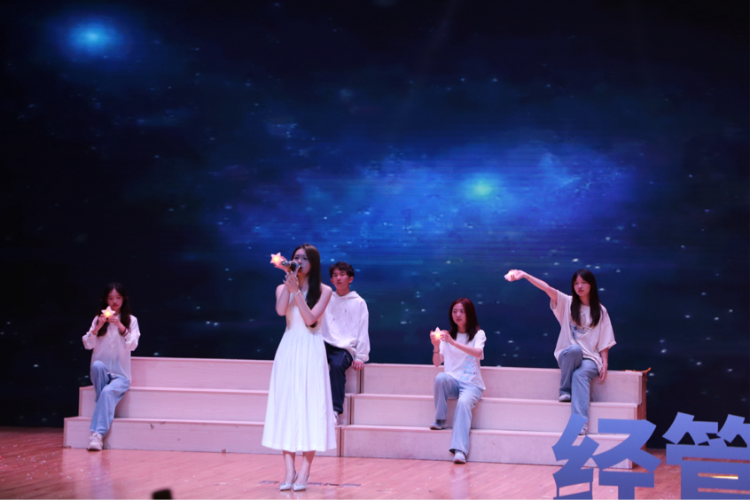 晚会以启程逐梦·未来可期·盛夏之约为主线,分为三大篇章,通过歌舞剧舞蹈脱口秀等形式,串联起毕业生对校园生活的眷恋与对未来的无限憧憬。晚会以一段承载着所有毕业生姓名的短视频开场每位学子的名字如星辰般逐一浮现,百余张青春笑脸在光影中定格,瞬间点燃全场温情。开篇舞蹈One Spark》由李思毕业生联袂演绎,诠释青春的热烈;覃丽颖、孙欣璐以清澈声线带来歌曲《我们的明天》唤醒校园记忆,观众轻声跟唱。原创脱口秀《怎么选都不错》以独特视角引发共鸣,席一、李姝璇化身学生会主席,幽默还原学生干部的成长轨迹晚会的温情时刻在辅导员登台时达到顶点21级辅导员献唱《晴天》,将师生情谊化作音符,引发现场共鸣。终章主题曲《剩下的盛夏》由肖骏杰、江苏伟等毕业生代表深情演绎,离别氛围悄然漫溢。